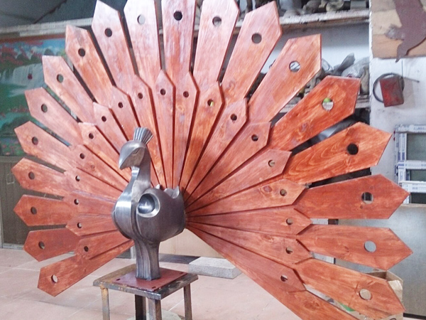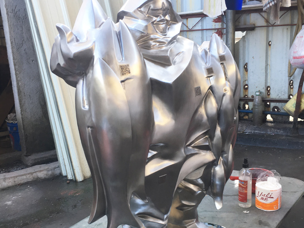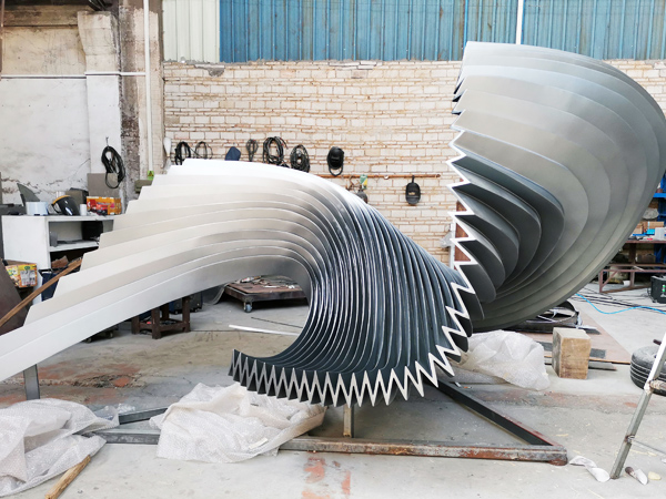 根據雕塑的基理輪廊畫線分塊放出紙樣,用紙樣擺放到金屬板材表面畫線分塊,用切割機切割,由專業金屬鍛造師鍛塑成形。